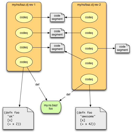Since we know (some of) these files are programs, and they are stored immutably, it seems worthwhile to perform a one-time analysis in order to track change more finely. codeq will break down the top level of the file into the corresponding program-language units (e.g. for Clojure, mostly function-defining forms). It gives each a SHA (if the block of code has never been seen before). It will then look inside and try to determine what the code is about (in context - since the same code can appear e.g. in different namespaces and thus name different things). The 'meaning' is normally some reference to a namespaced program identity, and for some purpose (definition, use). So a codeq encodes the location of a code segment in a file, and its semantics.